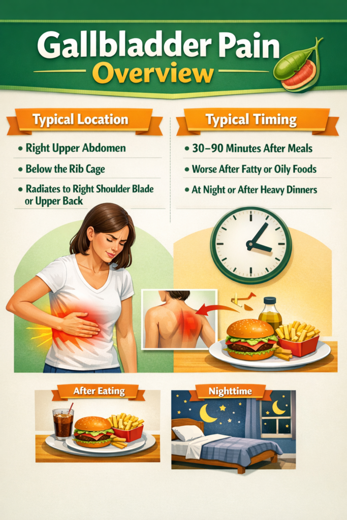 Gallbladder pain has a specific location and behaviour, and knowing this helps separate it from ordinary stomach discomfort.