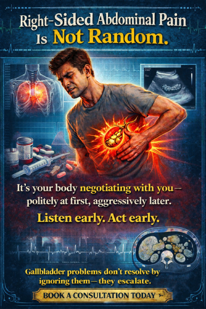 This article explains why right-sided abdominal pain is increasing, how to recognise when it’s gallbladder-related, and when surgery becomes medically necessary—before things spiral.